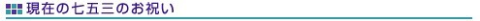「七?五?三」の起源は上記の様なもので、現在11月15日を中心に、全国の社寺でお参りが行われていますが、江戸時代の風習にちなみ、3歳の男子と女子、5歳の男子、7歳の女子がお参りをしています。