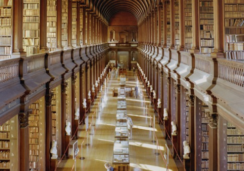 The most celebrated structure on the campus, which was founded by Queen Elizabeth in 1592, is the Old Library. Some have called the library’s main chamber, known as the Long Room, a “cathedral of the book” because of its timbered barrel-vaulted ceiling and shelving that resembles side chapels of an old baroque church. The Long Room is also where the famous Book of Kells (an illuminated holy manuscript circa 800) is kept under lock and key.