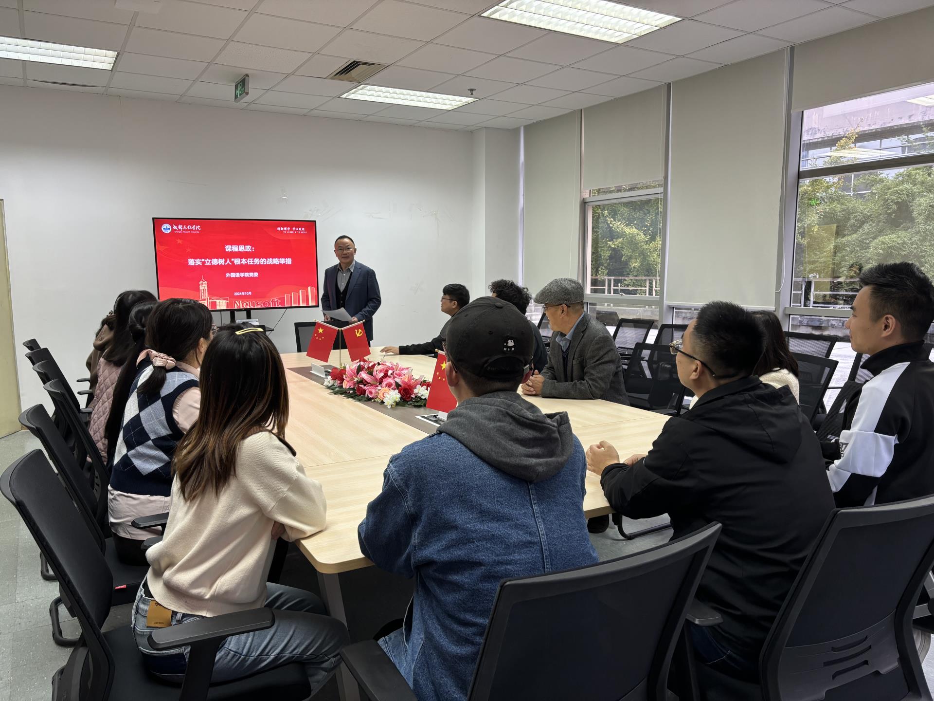 为深入贯彻落实新时代立德树人根本任务,全面推进课程思政建设,外国语学院分党委于2024年10月24日在C5201开展了以《课程思政:落实立德树人根本任务的战略举措》为主题的党课,此次党课由外国语学院院长张建华教授讲授。