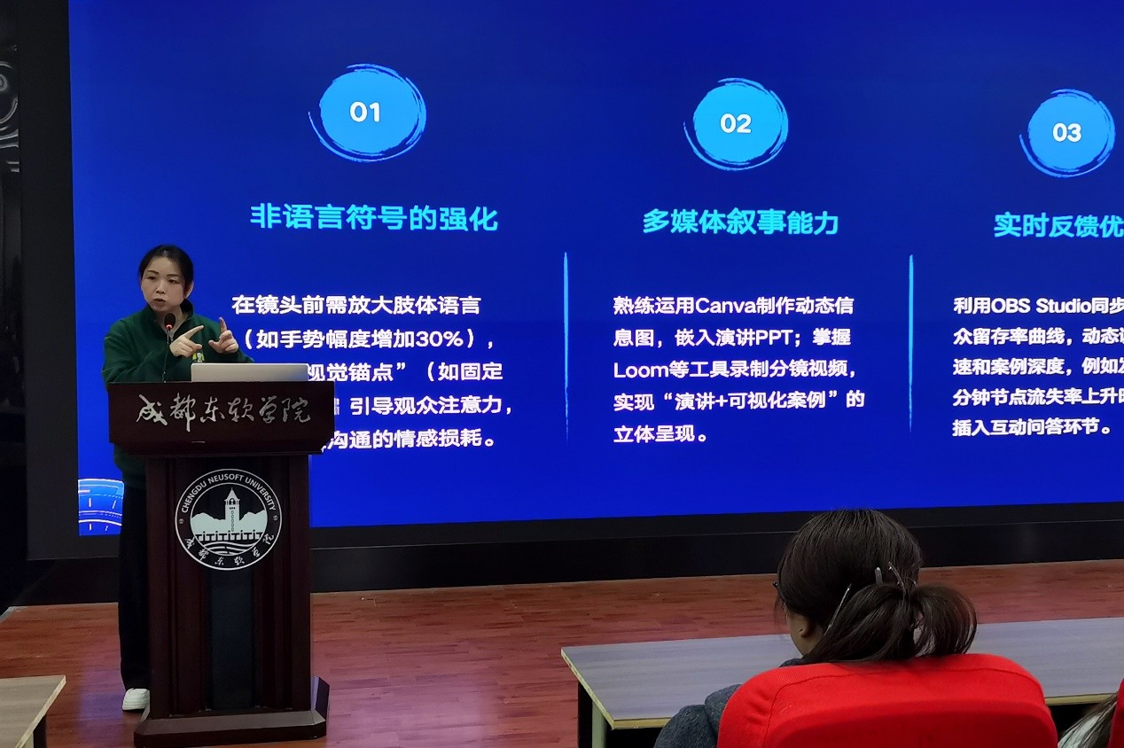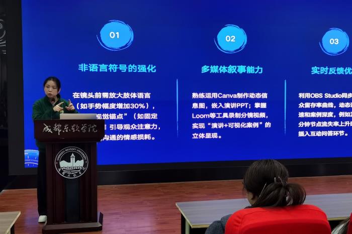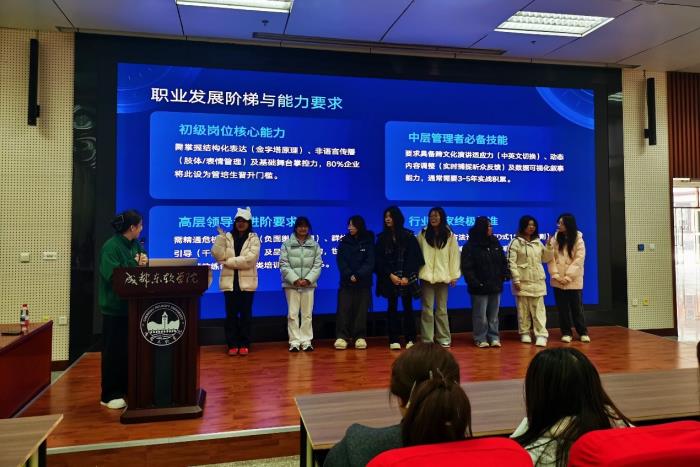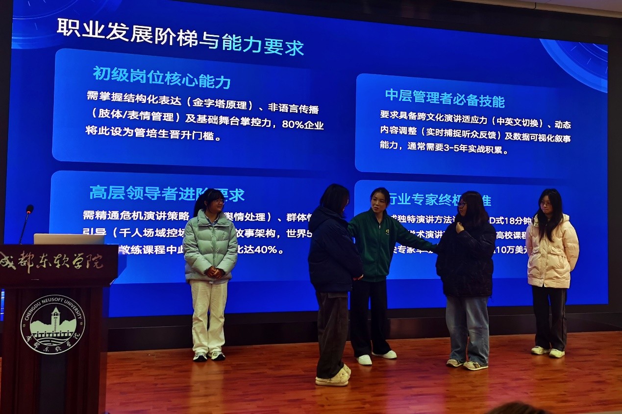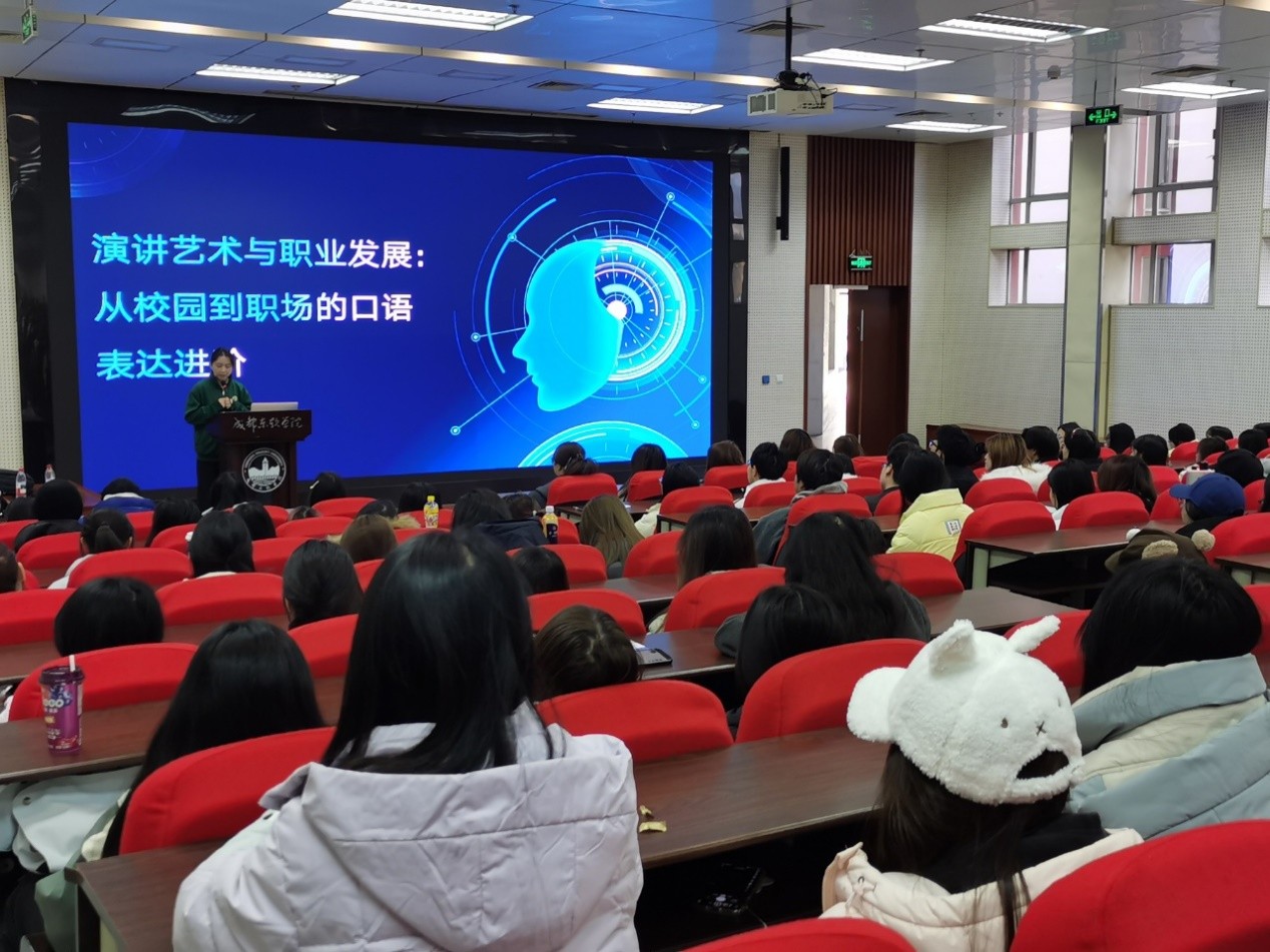 12月5日上午,成都东软学院外国语学院英语系2025级全体学生迎来了一堂别开生面的《口语(语音与交际)》课程。此次课程创新性地融入了校企合作元素,特邀重庆思静科技集团有限公司人力资源总监魏虹沁女士作为企业导师,在A3国际报告厅为学生带来了一场题为“从校园到职场的口语表达进阶”的专题授课。