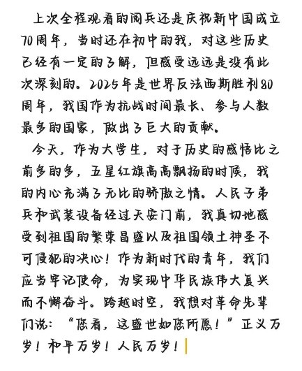 阅兵结束后,采访在座同学的感受,同学们难掩激动。有的说:“正步踏得像心跳,热血都沸腾了!”有的感叹:“战机掠过时,浑身鸡皮疙瘩,为祖国骄傲!”