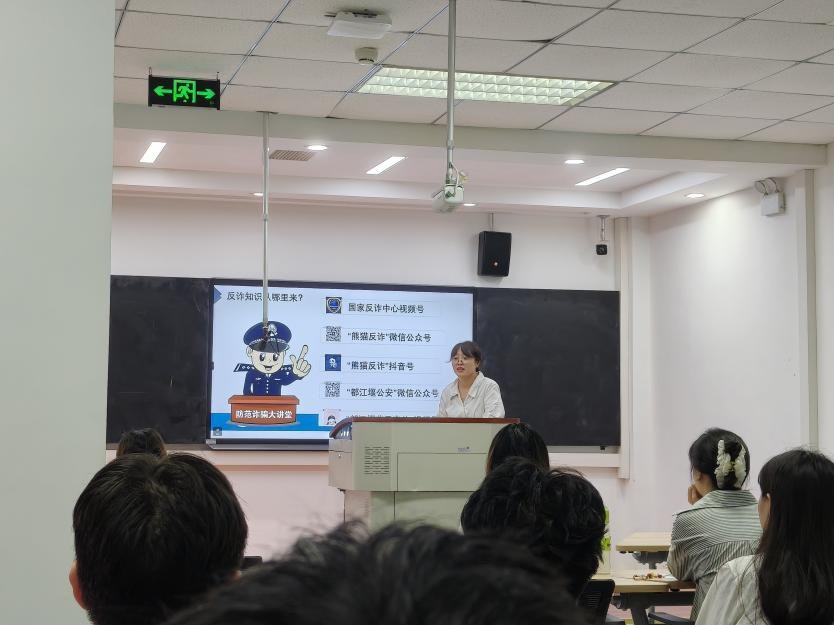 孙老师向新生们介绍了常见的电信诈骗手段和防范方法,如网络刷单诈骗、网络贷款诈骗、冒充公检法诈骗等。同时,还提醒新生们要保护好个人信息,不轻易相信陌生人的电话和短信,不随意点击不明链接,避免上当受骗。最后老师要求所有同学下载了国家反诈APP,关注了相关反诈公众号,再次提升了同学们的反诈意识。