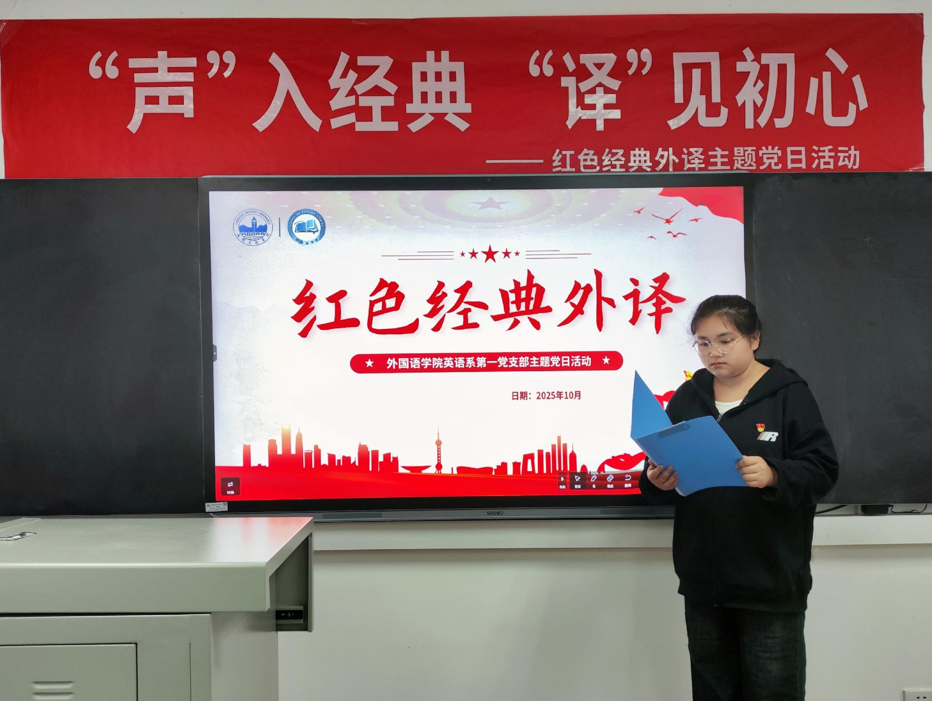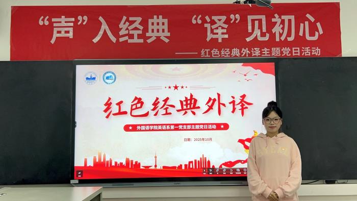 为深入学习贯彻习近平新时代中国特色社会主义思想,传承红色基因、弘扬革命文化,进一步推动红色经典的国际化传播,近日,外国语学院英语系第一党支部精心组织开展了以“‘声’入经典,‘译’见初心”为主题的红色经典外译主题党日活动。全体党员同志积极参与,以语言为桥、以声音为媒,在译介与诵读中重温革命岁月,感悟初心使命,活动取得圆满成功。
