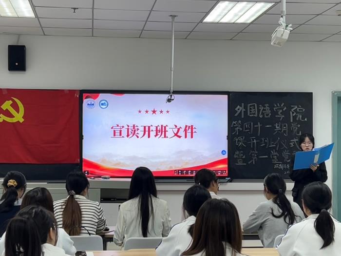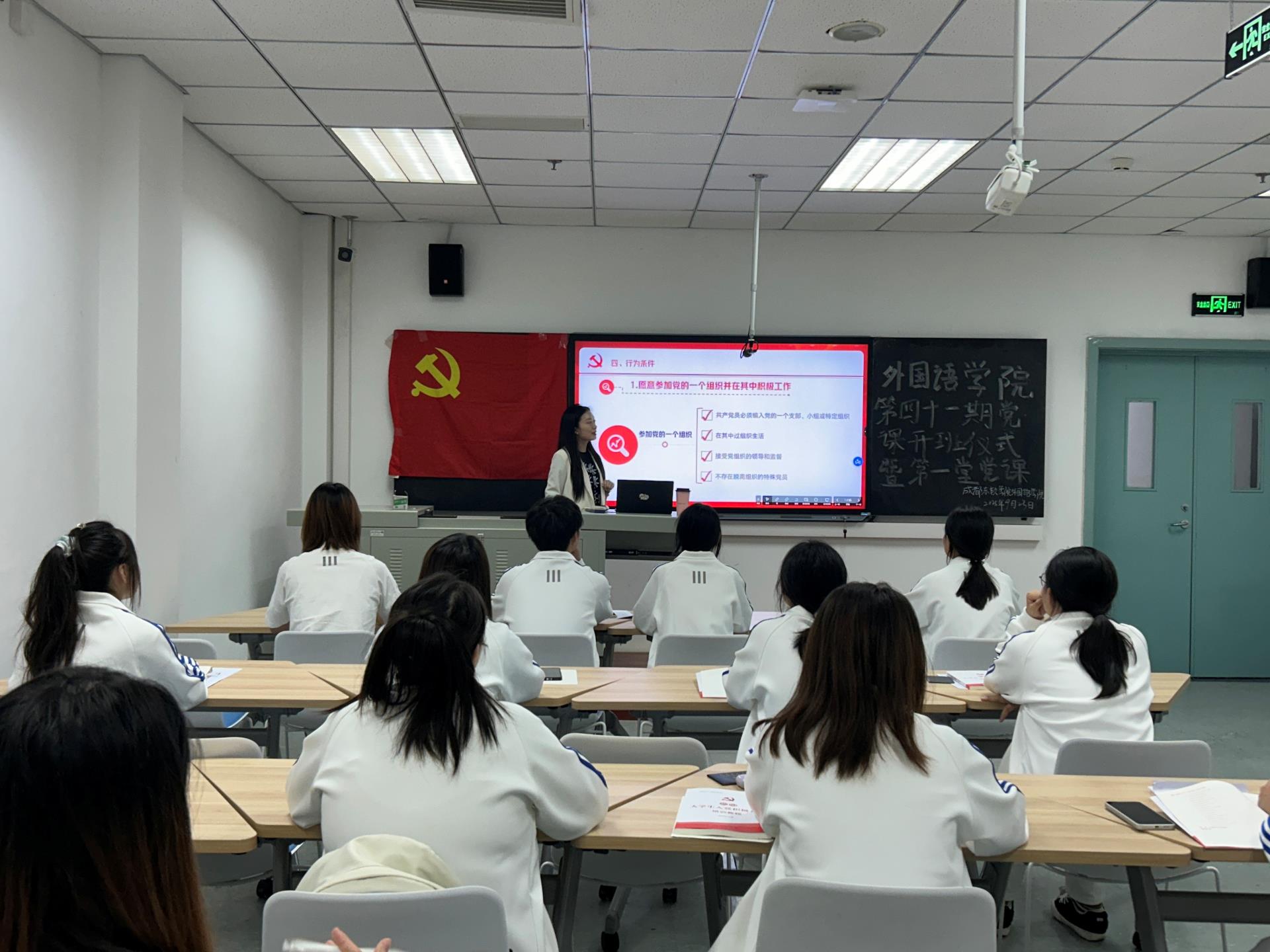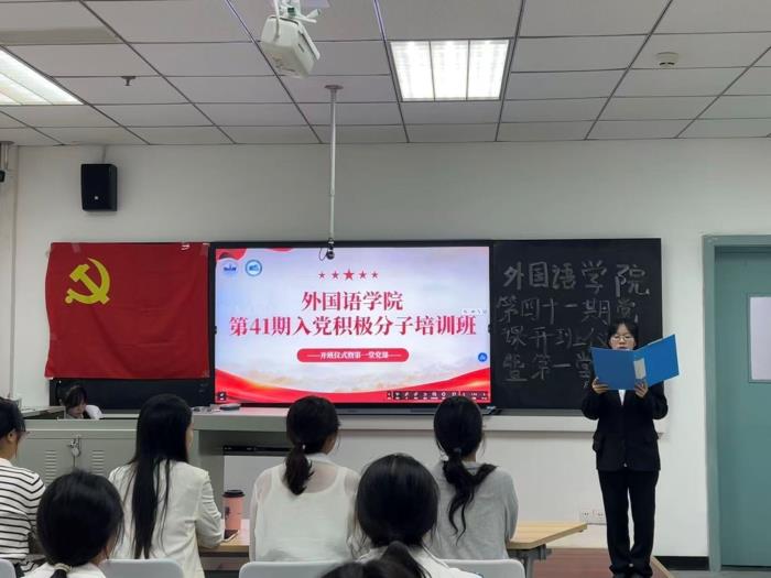 为深入推进习近平新时代中国特色社会主义思想的学习与贯彻,进一步夯实入党积极分子的党性根基、提升其理论水平,成都东软学院外国语学院分党委于2025年9月23日晚19:00在C5-101教室举行“第四十一期入党积极分子培训班开班仪式暨第一堂党课”。本次党课由外国语学院团委书记周小英老师围绕“明确入党条件,积极向党靠拢”主题展开讲授。