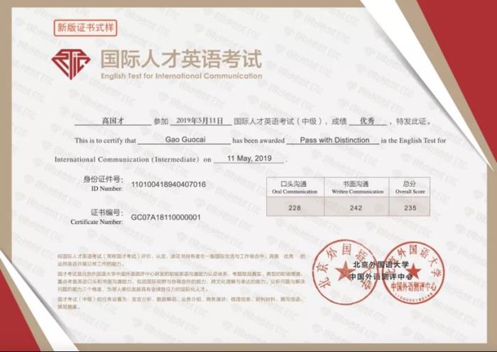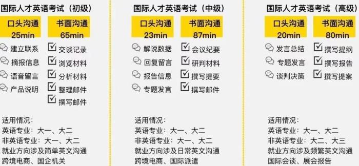 • 国才中级:评价在一般国际交流和工作场合运用英语的能力。含口头与书面沟通,考试约110分钟。