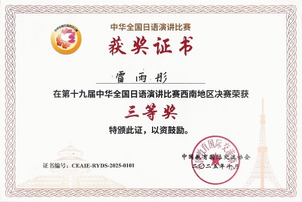 10月25日,“第十九届中华全国日语演讲比赛西南地区决赛”在西南大学圆满落幕。我院2023级日语专业学生雷雨彤凭借扎实的语言功底与出色的现场表现,从众多选手中脱颖而出,荣获三等奖,指导老师内山朝子、李秦朗获得优秀指导教师奖。