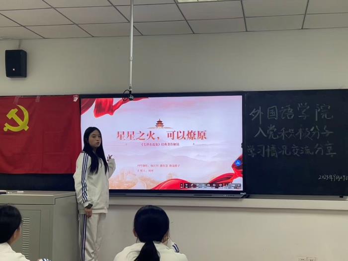 2025年9月29日,为深化入党积极分子对党的理论知识的理解,提升党性修养,外国语学院组织开展第四十一期入党积极分子培训班学习情况交流分享会。学员们围绕多个红色经典主题,结合自身思考制作PPT,进行了一场深刻且富有成效的思想交流。