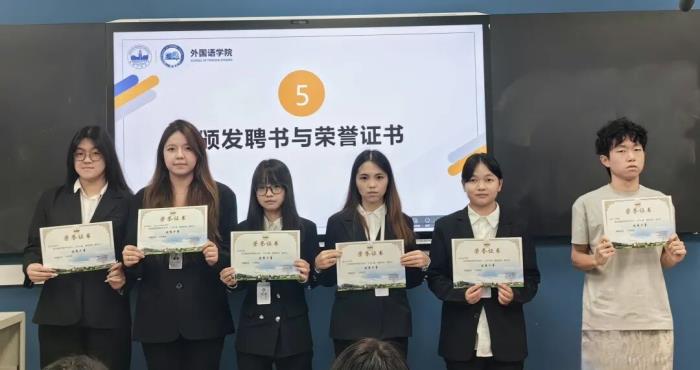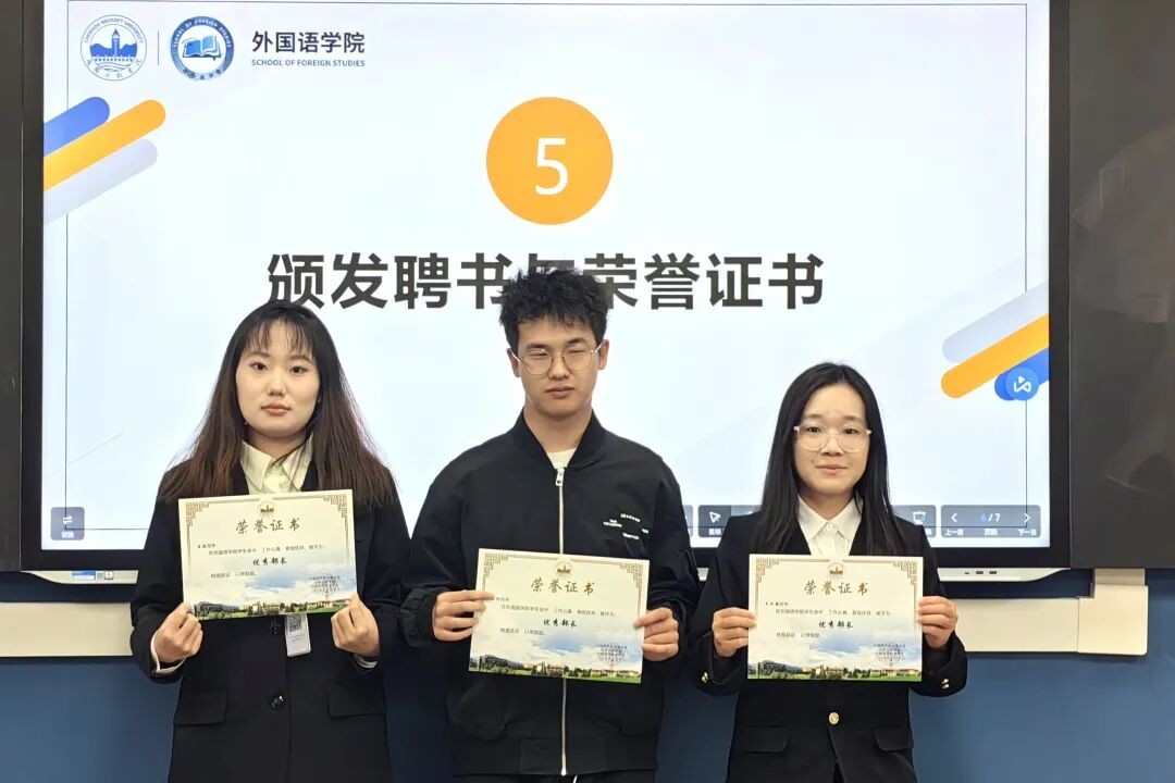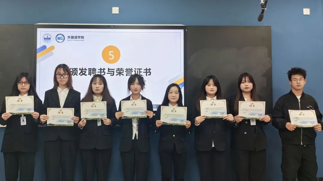 外国语学院团委兼职副书记李宇梦为外国语学院学生会第四届部长团颁发聘书,感谢他们在学生会的辛勤付出。