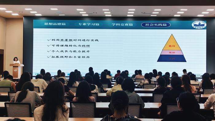 最后,她认为利用寒暑假参与实践意义重大,既能将课题转化为科研,又能在“躬行”中实现个人成长、拓展视野,如同“学识-见识-格局”的金字塔,实践是搭建上层建筑的基石。她给出行动指南,鼓励大家大胆 “去尝试、去寻找、去感受、去试错”,不必畏惧暂时的迷茫。