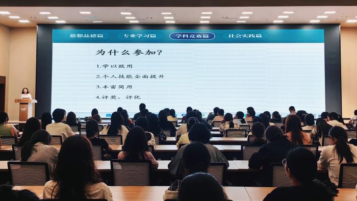 然后,她指出参赛是 “学以致用” 的试炼场、“技能全面提升” 的加速器,更是 “丰富简历” 和 “评奖评优” 的关键。她还制定竞赛规划“时间轴”:大一侧重体验探索、扩充人脉、大胆“试错”;大二学会取舍、找准优势、完善规划;大三明确方向、深耕赛场、为升学就业蓄力;大四收获成果、完成实习与毕业论文。