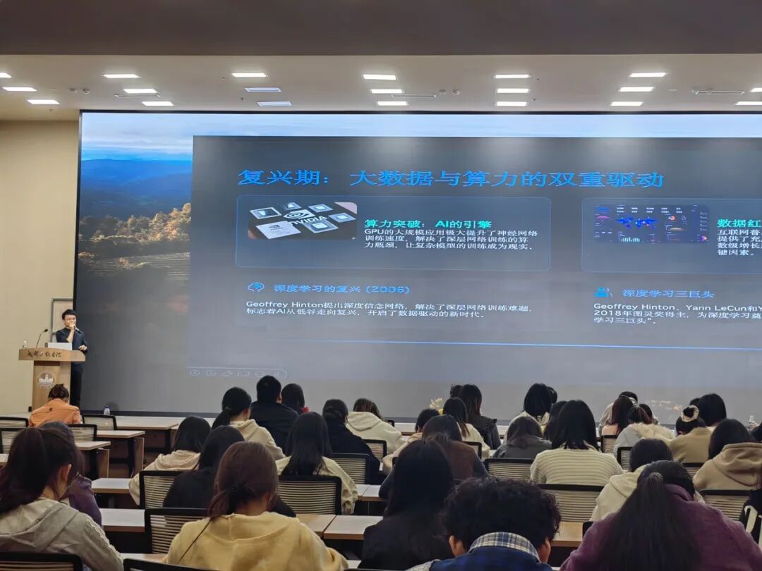 陈聪老师以《AI技术发展与未来机遇——一场关于未来的对话》为主题,结合20年世界500强企业研发与管理经验,系统梳理了人工智能从技术萌芽到产业落地的完整发展脉络。他从算力突破、算法革新、数据应用三大核心维度,深入解读AI在通信、智能制造、企业数字化转型等多个领域的实际应用场景,结合真实行业案例剖析当前人才需求结构与能力要求,帮助同学们清晰把握AI行业的就业风口、成长路径与职业晋升空间,为大家规划未来发展方向提供了清晰参考。