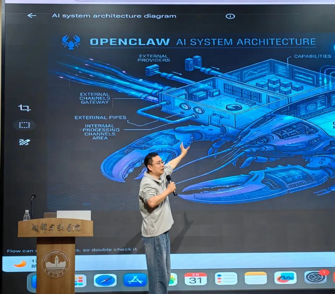 翟浩老师聚焦OpenClaw专题,结合自身在科技企业、影视文娱及元宇宙领域的跨界实践经验,对技术框架、应用场景与行业价值进行了细致拆解。他不仅讲解了技术底层逻辑与实现路径,还结合科技文娱融合、数字内容创作、虚拟场景搭建等前沿案例,分享了该技术在产业中的落地模式与发展潜力。同时,他结合外语专业特色,为同学们讲解了“语言能力+数字技术”的复合型发展思路,帮助大家拓宽职业边界,为个人规划与就业选择提供了极具实用性的参考。