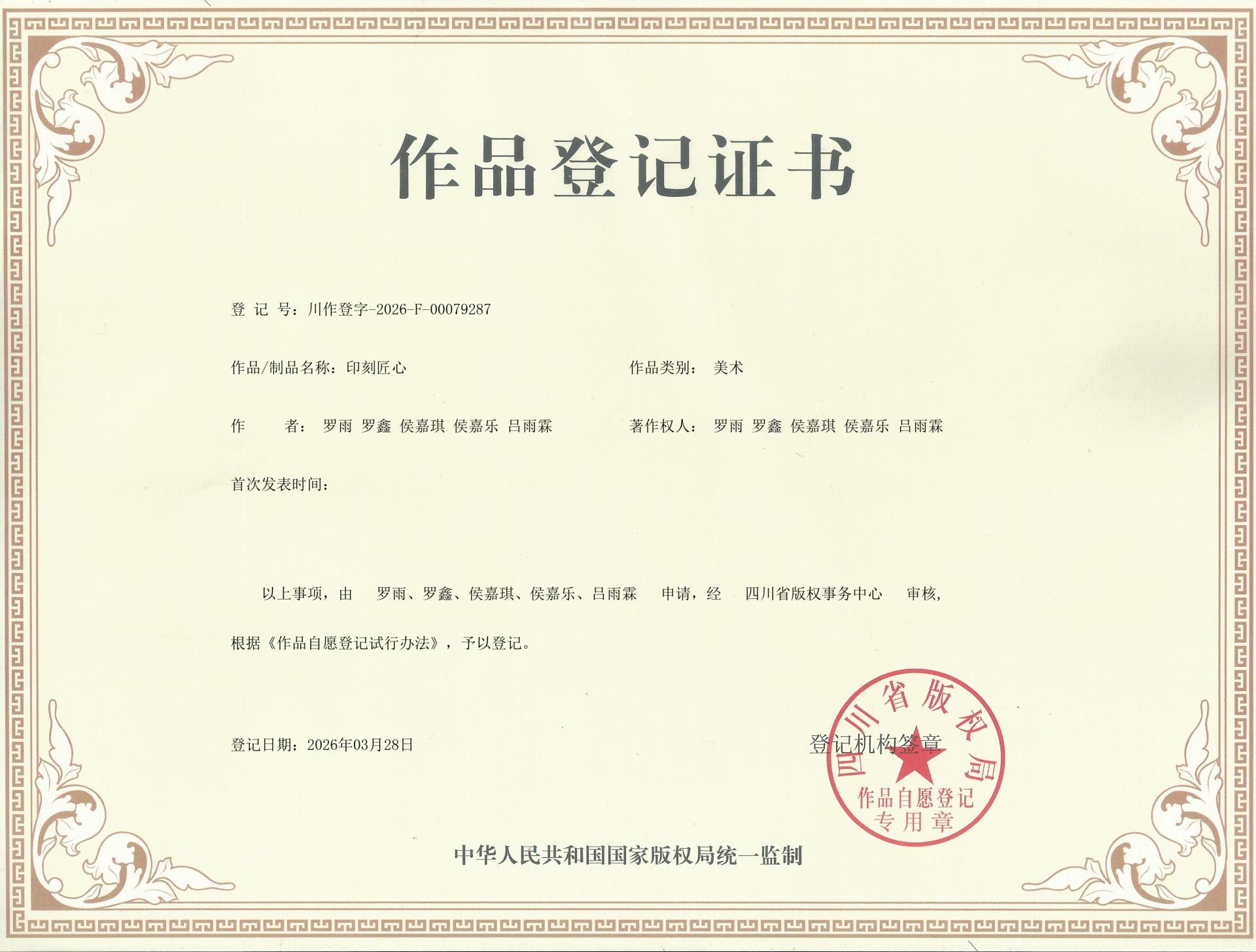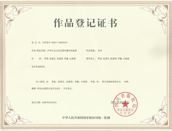 近日,外国语学院学子团队再传佳音,由罗雨、侯嘉琪、侯嘉乐、罗鑫、吕雨霖共同创作的《泸州江北古法甘蔗红糖宣传海报》等系列作品,成功通过四川省版权事务中心审核,斩获“四川省版权局作品登记证书”(登记号:川作登字-2026-F-00078478等)。这4份省级著作权认证,是对学子原创设计成果的权威认可,更是学院培育学生跨学科综合能力的扎实成果体现。