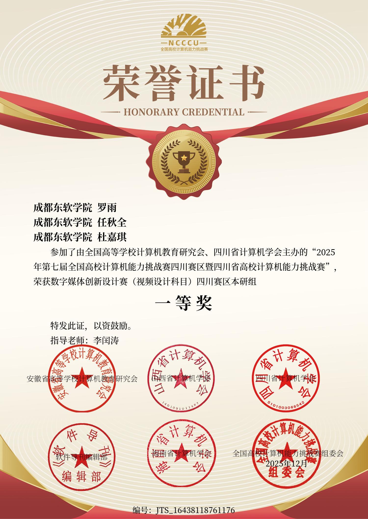 这份亮眼的落地成果,源于团队在赛事历练中打磨的过硬能力与创新思维。此前,在第七届全国高校计算机能力挑战赛数字媒体创新设计赛中,由罗雨带领,任秋全、杜嘉琪组成的外院学子团队,跳出传统纯语言学习框架,将专业语言优势与数字技术、创意设计深度融合,凭借作品《文脉寻踪》一举斩获四川赛区本研组一等奖,更以全国总分第一的优异成绩摘得全国一等奖,拿下赛事专项奖金。