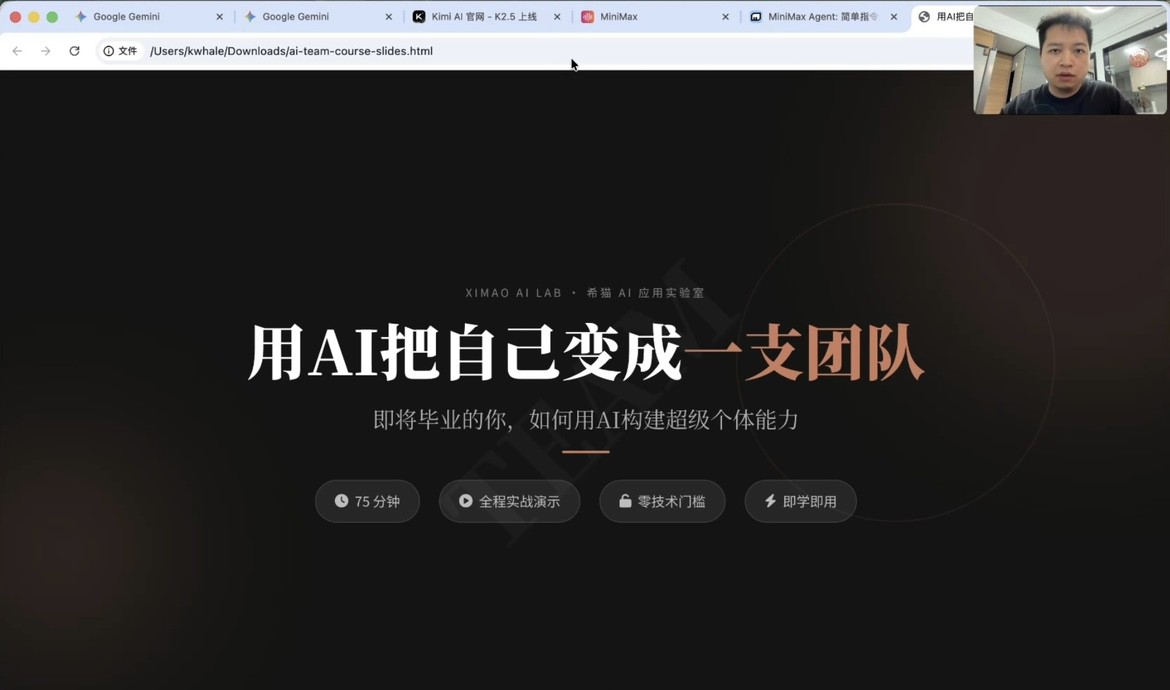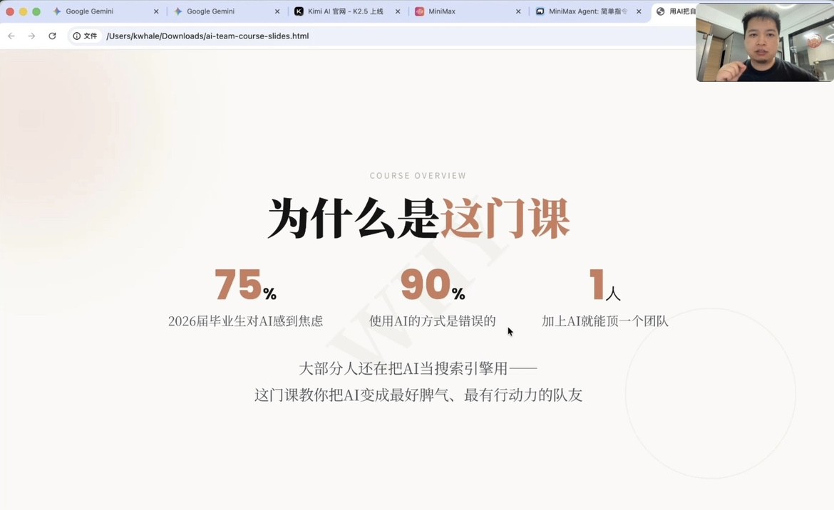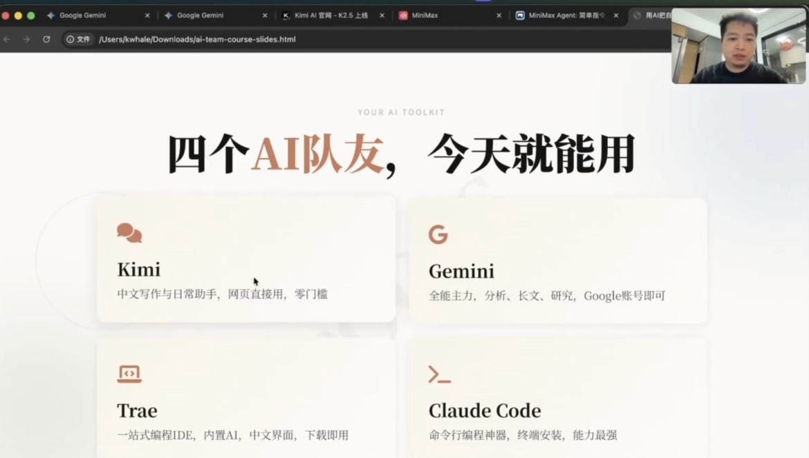 分享过程中,他结合毕业生求职、创业两大核心需求场景,系统拆解了Kimi、Gemini、Trae、Claude Code四大主流AI工具的定位差异与实战用法,并全程进行实操演示,内容干货满满、实用性极强。