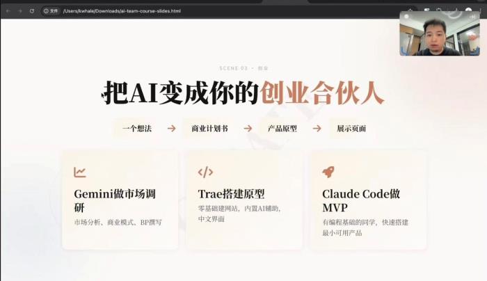 针对创业场景,他拆解AI作为创业合伙人,从想法到产品原型的完整路径,为有创业意愿的学子提供了清晰指引。